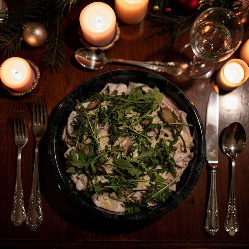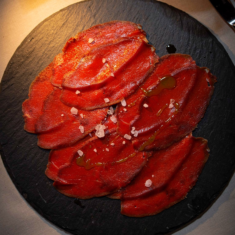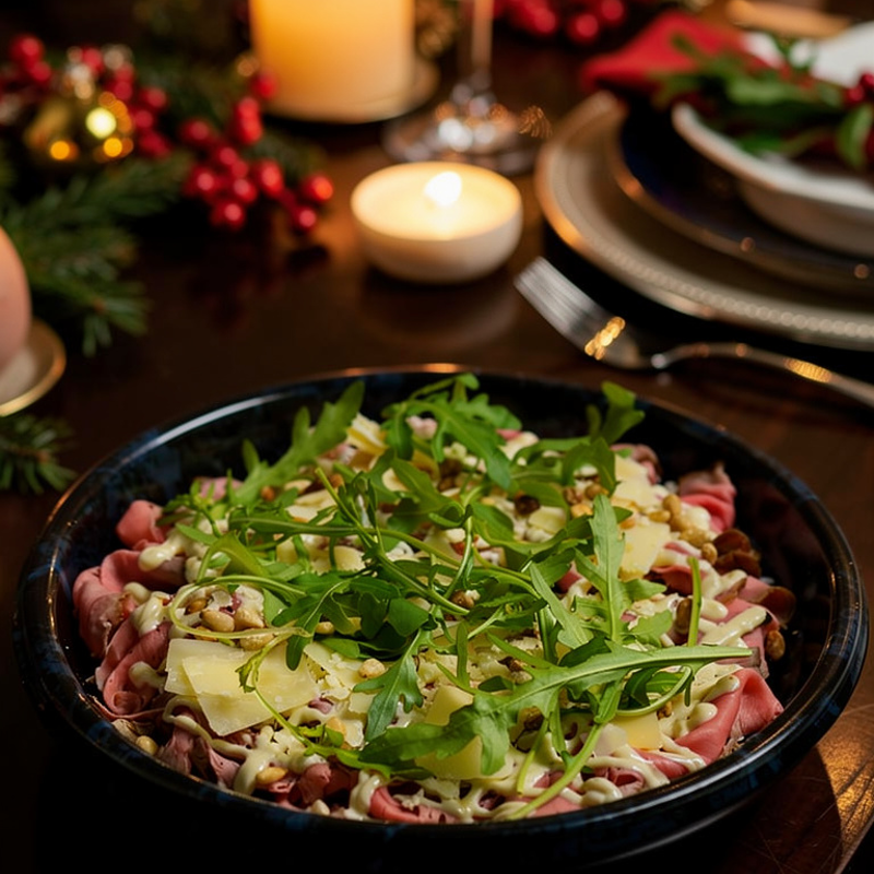Fijn gesneden rundsvlees, truffelmayonaise, pijnboompitten, parmezaan en rucola