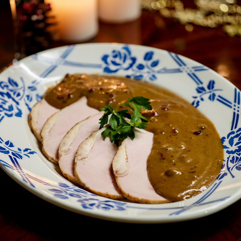 Deze kalkoen wordt door ons ovenklaar gemaakt en is ruim voldoende voor 6 tot 8 personen. De bijhorende warme saus kan je kiezen uit ons assortiment en is inbegrepen in de prijs.