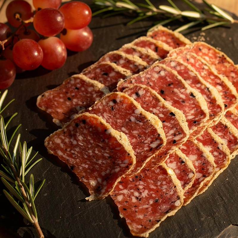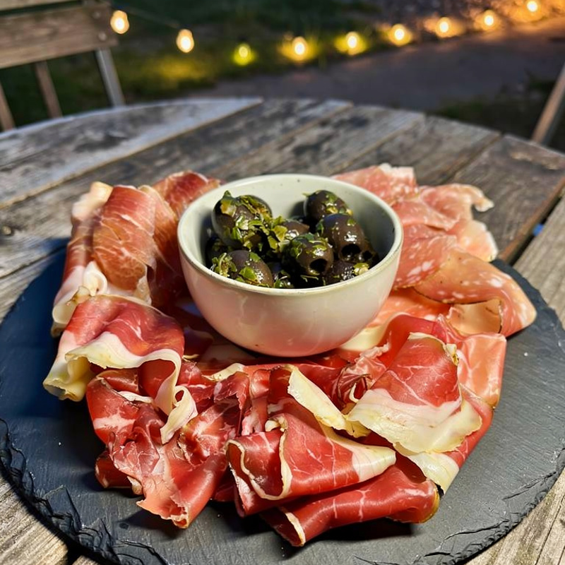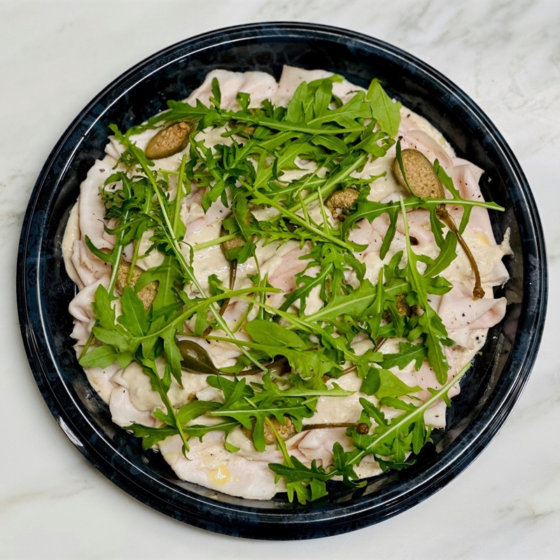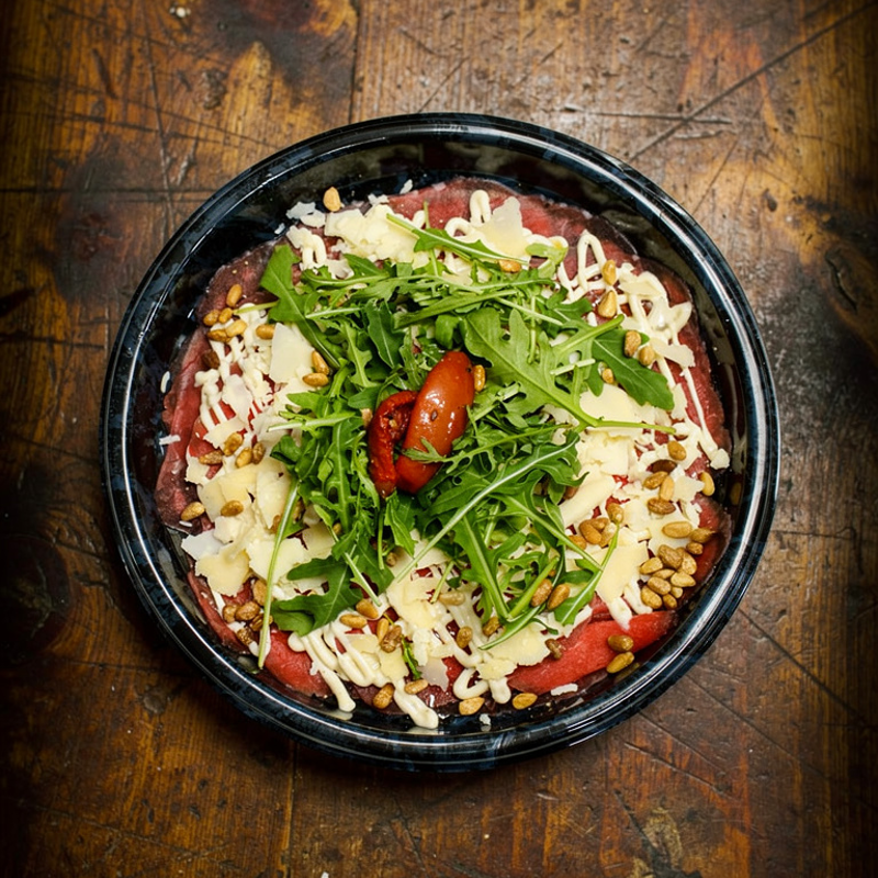 Fijn gesneden rundsvlees, truffelmayonaise, pijnboompitten, parmezaan en rucola