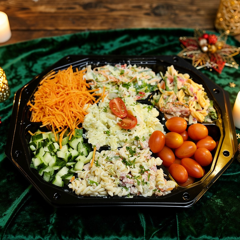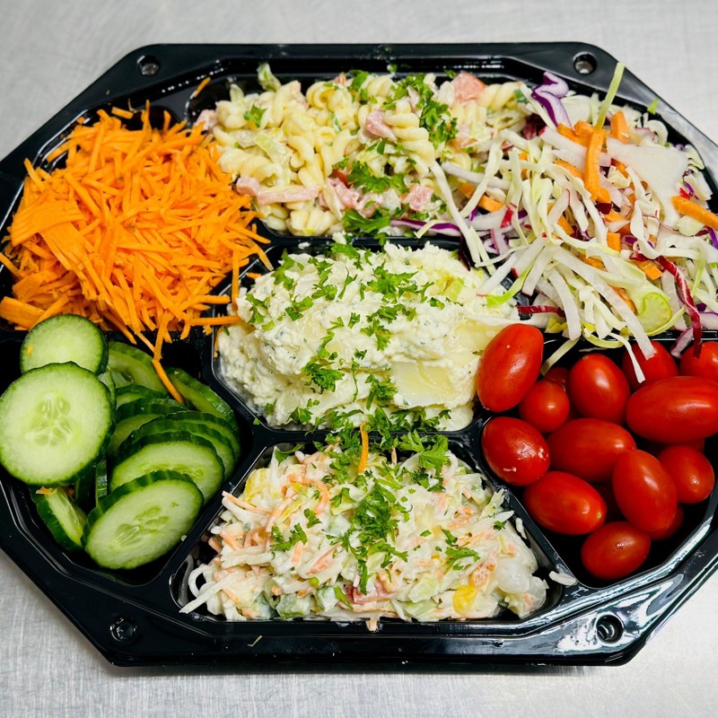 Aardappelsalade - pastasalade hesp - geraspte wortel - komkommer - tomaatjes - groentesalade - rauwkostmix
