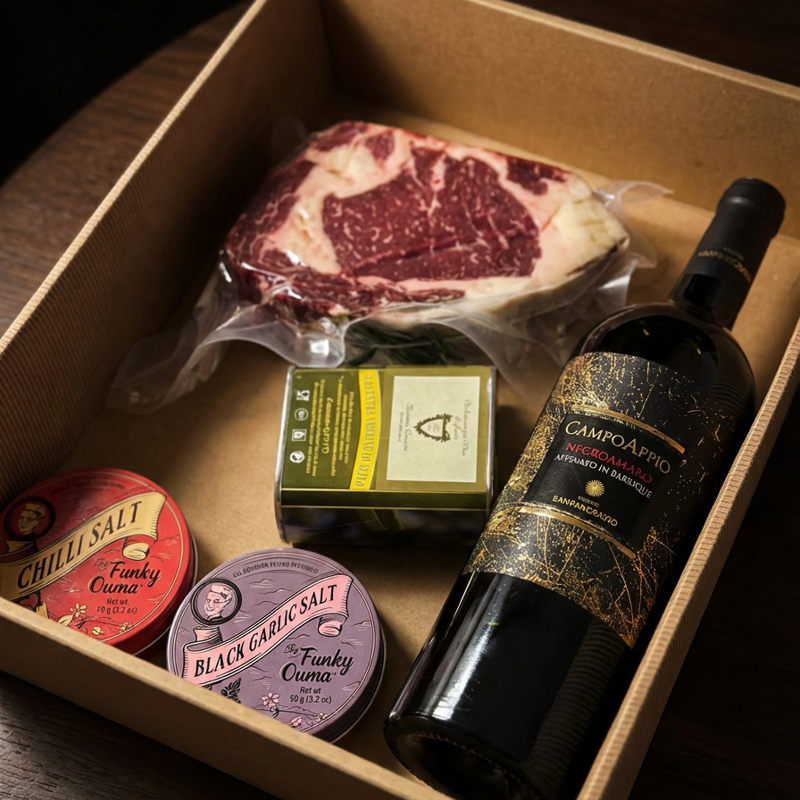 - Côte à l'os Dry aged (2 pers.) - Een bijpassende volle, intense rode wijn - olijfolie - chilisalt - black garlicsalt